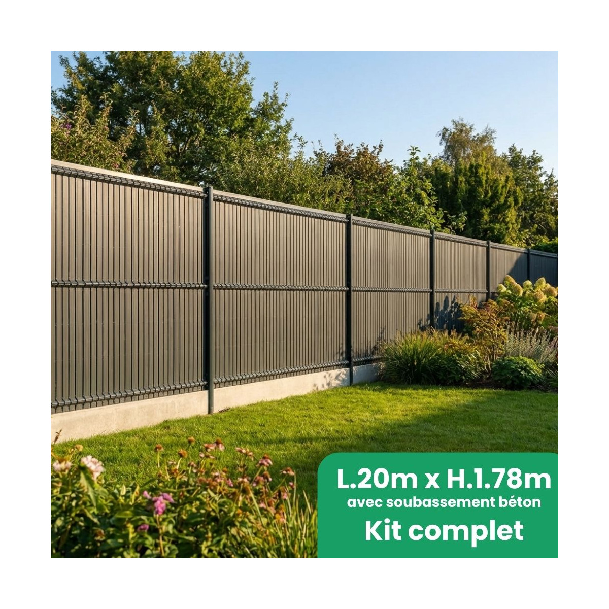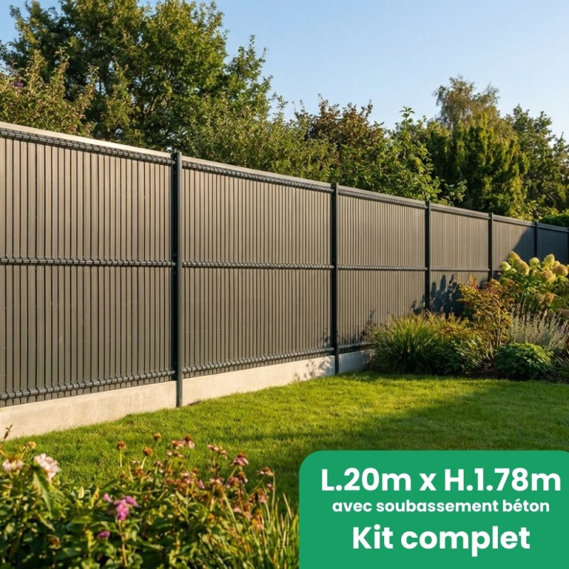 - 8 panneaux rigides fil Ø4/5gris 7016 H1m53, 8 plaques soubassement béton droite H 25cm, 9 poteaux renforcés gris 7016 H2m20, 2 sachets de fixations, 8 kits d'occultation lattes PVC