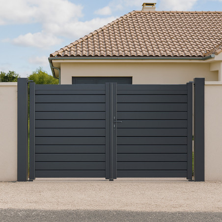 Poignée, carrée inox, plaque de propreté, gâche, cylindre, visserie, sabot de sol, gonds, crapaudines, butées latérales